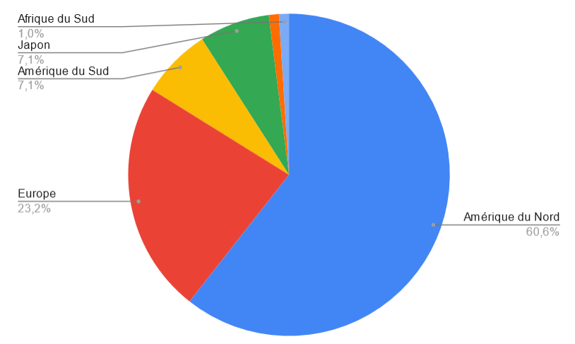 CĂŽtĂ© gĂ©ographie, les entreprises sĂ©lectionnĂ©es sont rĂ©parties Ă travers le monde mais avec une forte prĂ©pondĂ©rance sur lâAmĂ©rique du Nord (52% Etats Unis, 8% Canada).