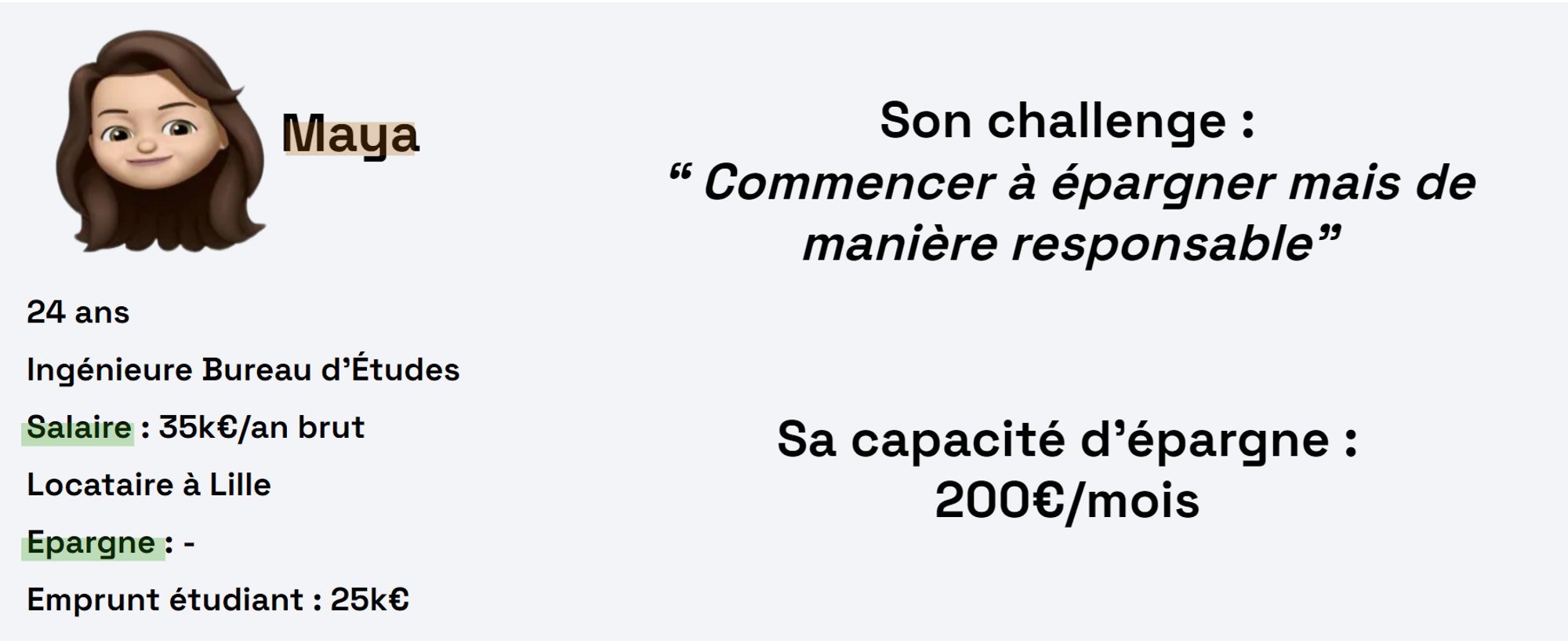 L’objectif dans un premier temps : mettre de côté au moins 4 mois de charges. Dans le cas de Maya, les charges comprennent : loyer, mensualité d'emprunt et ses dépenses courantes.