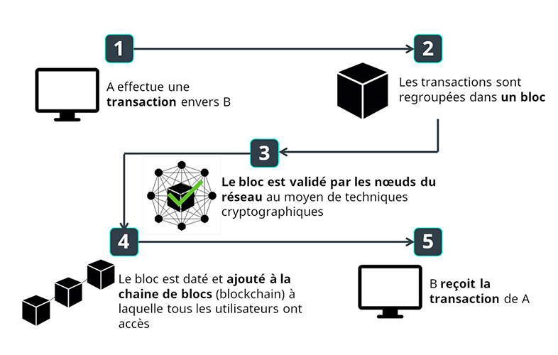L’exemple le plus connu est la blockchain Bitcoin qui permet des paiements en ligne de pair à pair sans l’intervention d’une quelconque institution financière.